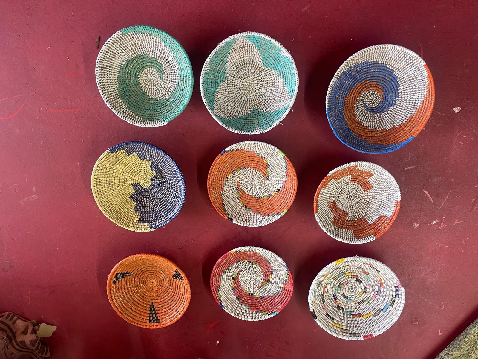 This vibrant 9‑basket collection showcases the full artistry of traditional weaving. Each basket features its own unique pattern — spirals, starbursts, color‑blocked segments, and geometric designs — all crafted with tightly coiled fibers in rich, saturated colors. Displayed together, they create a striking gallery wall that brings warmth, culture, and visual rhythm into any space.