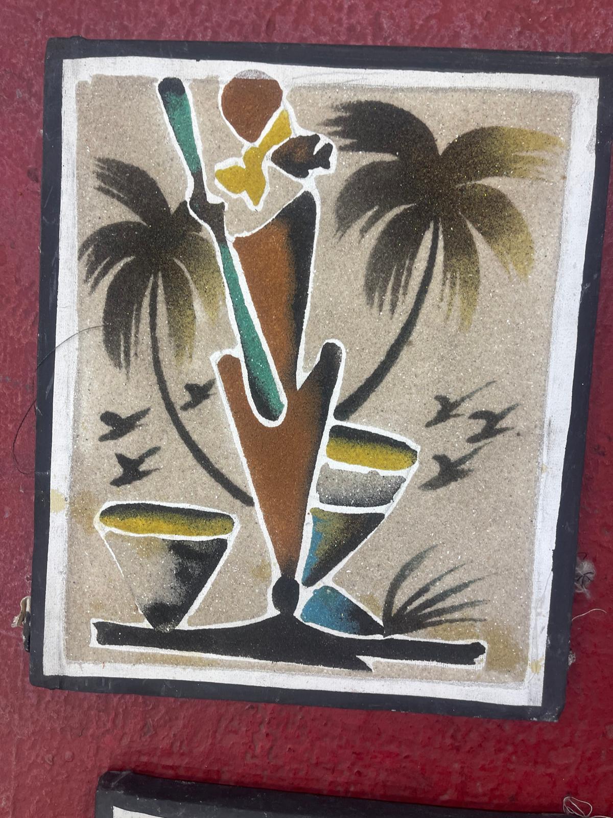 Bring the rhythm of African village life into your space with this vibrant handcrafted sand painting. This artwork features a bold silhouette of a traditional drummer pounding a mortar, surrounded by iconic palm trees and flocks of birds flying across the warm horizon. With rich earthy tones, white accents, and natural sand texture, the piece beautifully captures the essence of rural life, culture, and musical heritage.